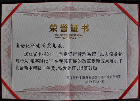 河北省自動(dòng)化研究所黨總支在我院開(kāi)展的改革創(chuàng)新成果展示評(píng)比活動(dòng)中申報(bào)的“‘固定資產(chǎn)管理系統(tǒng)’助力設(shè)備管理步入‘?dāng)?shù)字時(shí)代’”榮獲一等獎(jiǎng),“設(shè)備零配件子母標(biāo)簽”榮獲二等獎(jiǎng)。